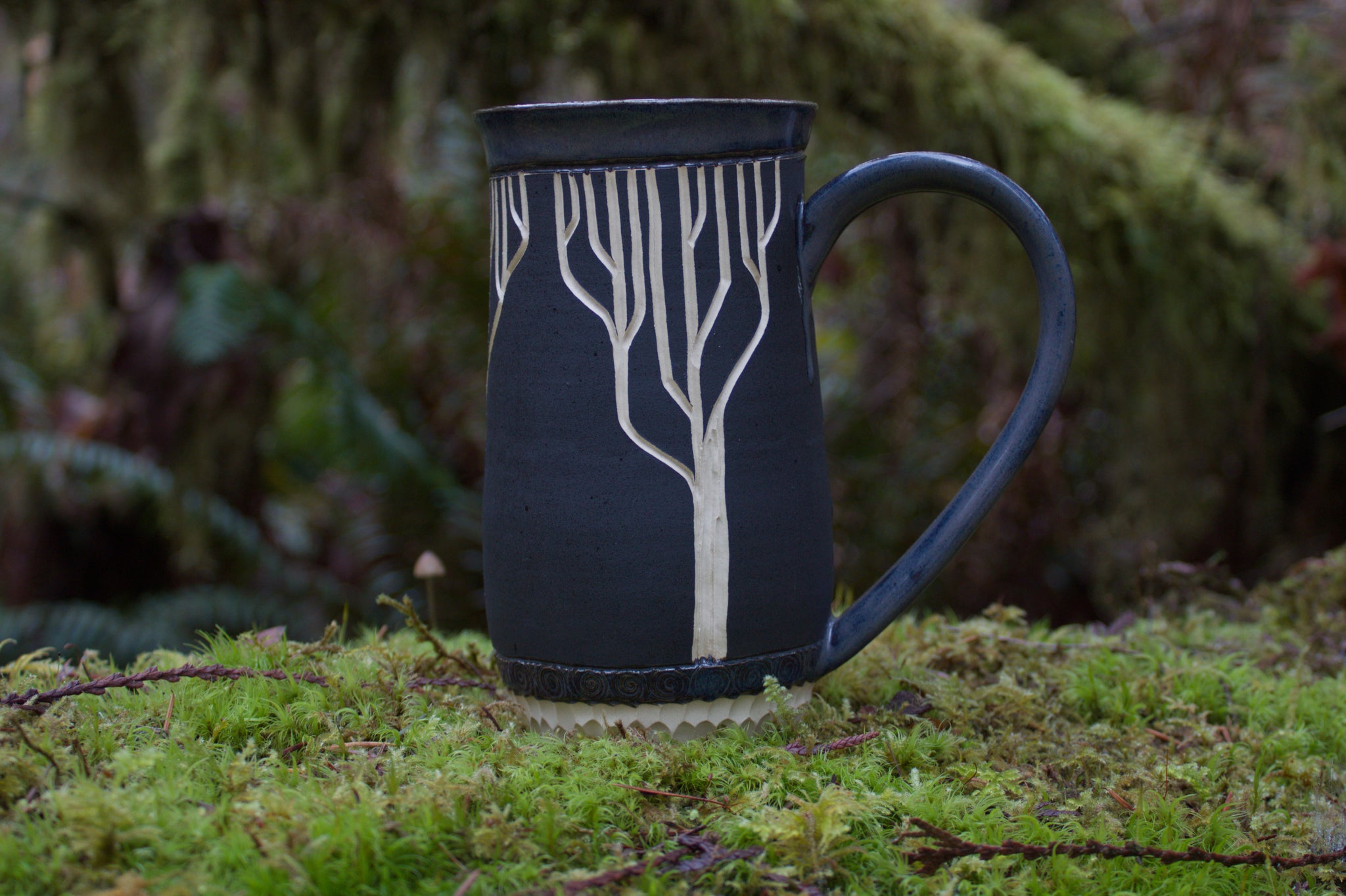 I use stoneware clay made by a local shop, commercially made food-safe ceramic glazes, and sand the bottoms of each piece so it doesn’t scratch the surfaces it sits on. This mug is dishwasher and microwave-safe; however, hand-washing and avoiding sudden temperature changes will ensure your ceramic ware lasts for eons.
