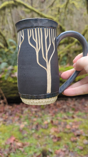 Elevate your beverage rituals or add to your art mug collection! Grace your cupboard with the presence of handcrafted pottery. Featuring one-of-a-kind carved designs and a combination of glossy, matte, smooth, and textured elements.